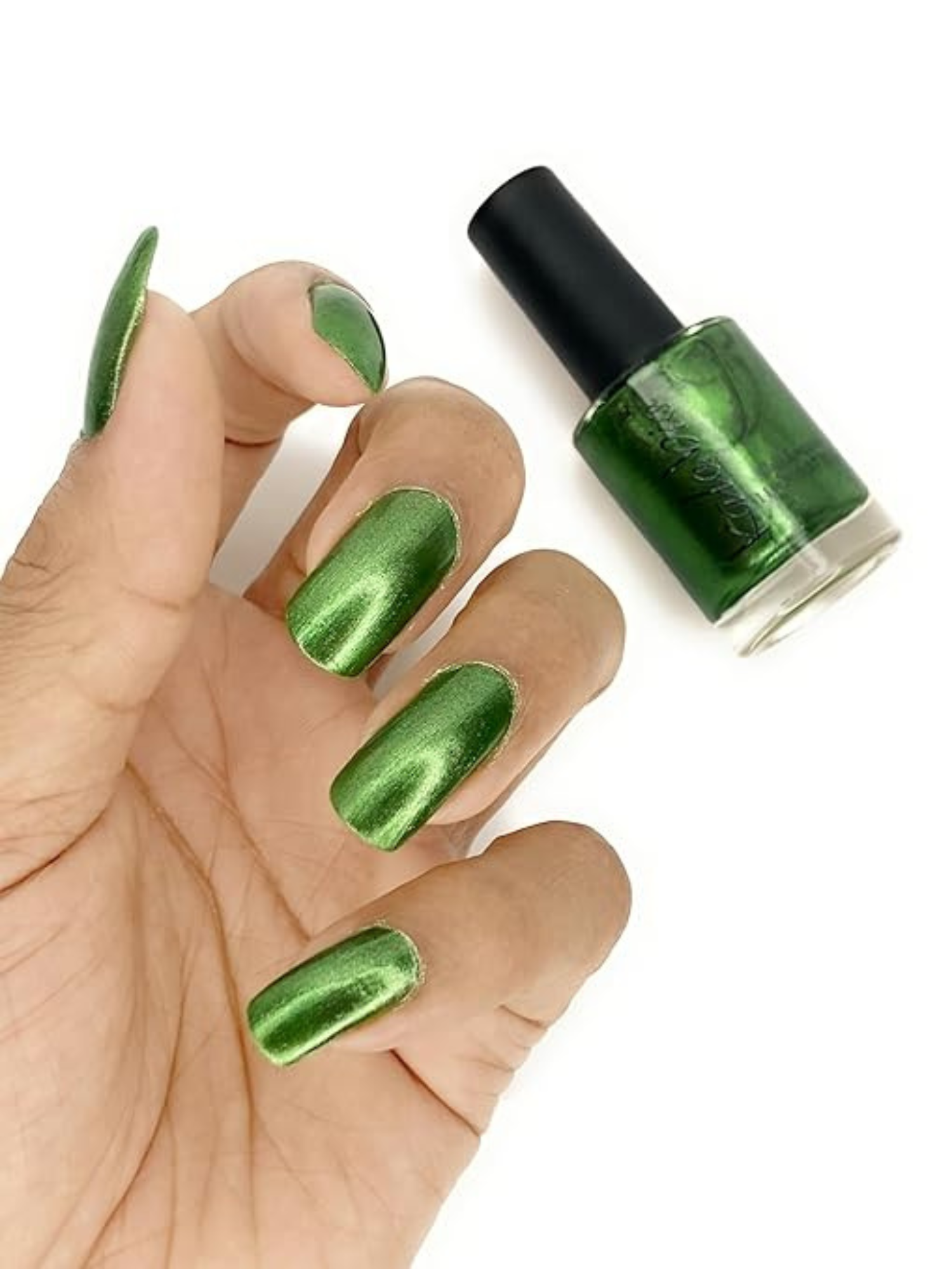 - Deep emerald green metallic polish with high-shine reflection